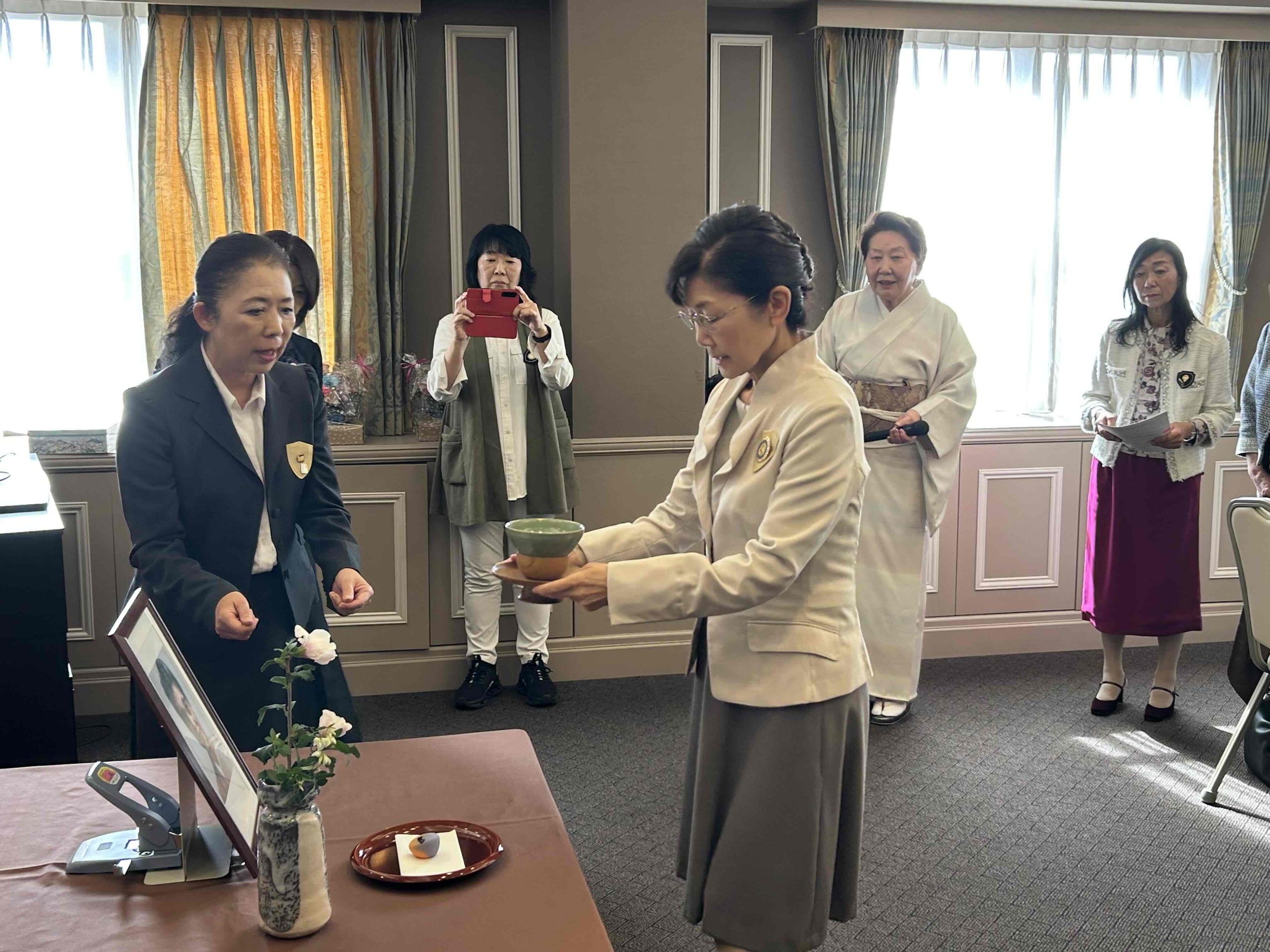 今年も星野妙子会長が代表で献上し、その後チャーターメンバーの平井会員より千嘉代子様のお話やお献茶についての作法のレクチャーなど、新入会委員や既存会員もソロプチミストとしての心を再認識できたひと時となりました。