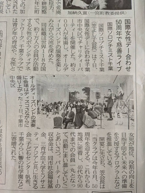 3月8日の国際女性デーの前日の7日、SI千葉クラブのチャリティーパーティー会場オークラ千葉ホテルのロビーに、国際女性デーのキャンペーンと50周年記念を合わせた企画として、巨大プレートにラミネート文字と紙花とミモザで飾られたフォトスポットを用意し、皆さんに記念写真を撮影していただいて広報に努めました。地元新聞にも取り上げられました。