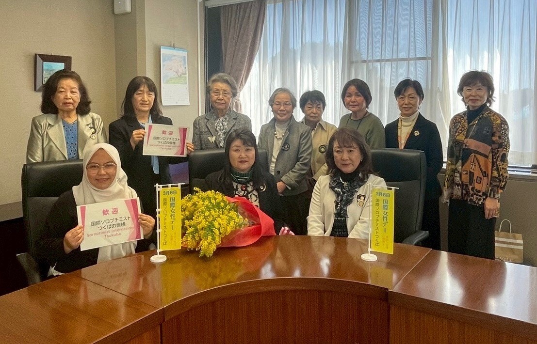 2026年3月5日(木)、筑波大学本部棟4階役員会議室にて、女性副学長としてご活躍の西尾チヅル教授を表敬訪問。さらなる協力関係の深化を願って、国際女性デーのシンボル花ミモザの花束を贈呈しました。冨山会長はじめ会員9名とSIつくば奨学生1名 (インドネシアから筑波大学大学院に留学中)が参加。奨学生はこの春、無事に卒業して帰国し幼児教育の仕事に就くにあたり、SIつくばへの感謝と共に、今後は自分が女性達を支える側にまわれるよう頑張りたいとの思いを語ってくれました。西尾教授からは、『国際的に女性が女性をエンパワーメントする、このような好循環が続いて欲しい』とのお言葉をいただきました。国際女性デー2026関連記事として、3月14日(土)に茨城新聞に掲載されました 。また、今回の表敬訪問をきっかけに、財団の女性研究者賞の応募へと繋がりました。