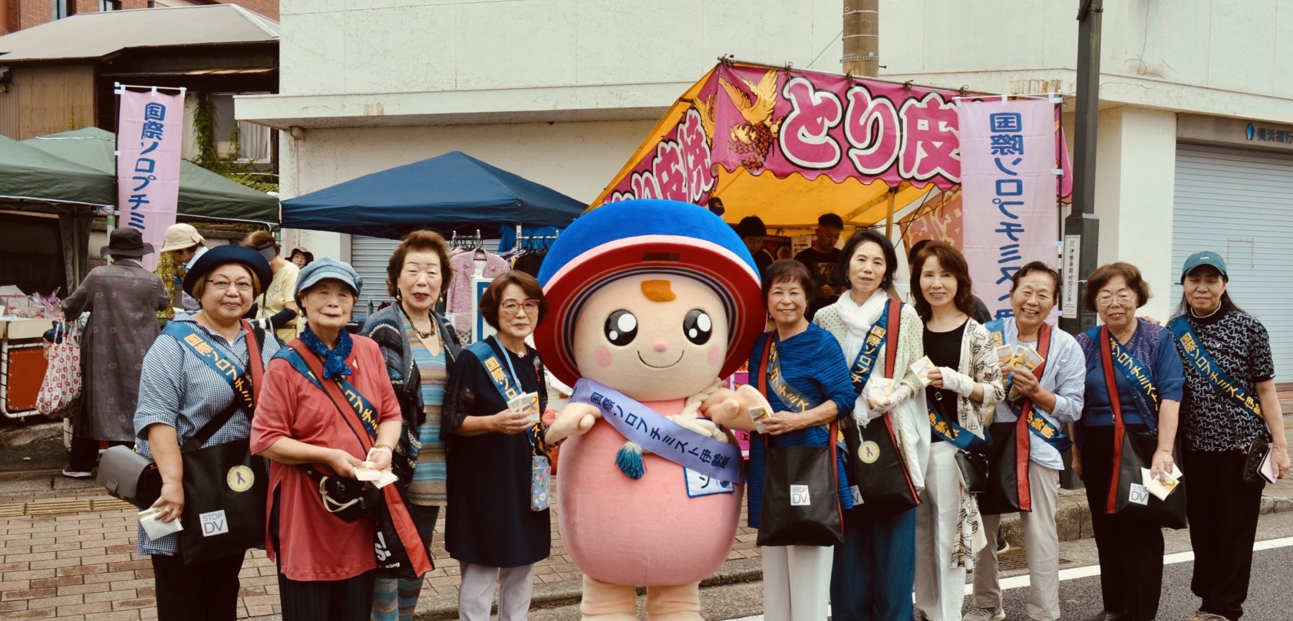 歩行者天国のメイン通りでは、ご当地キャラクターの「クルリン」ちゃんと一緒に市役所との協働継続事業である「ザ・ストップ・DV」活動を繰り広げました。