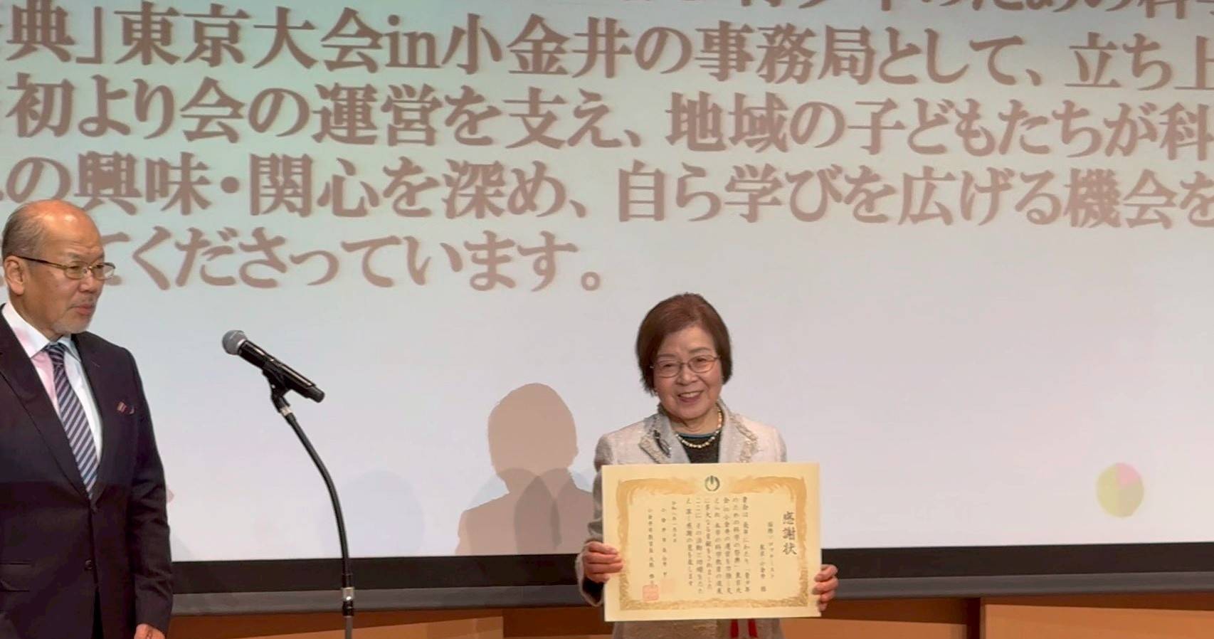 小金井市長 白井 亨・小金井市教育長大熊 雅士 連名により小金井市に於いての国際ソロプチミスト東京-小金井の活動に感謝状が授与されました。